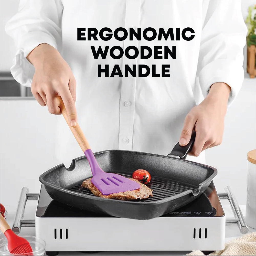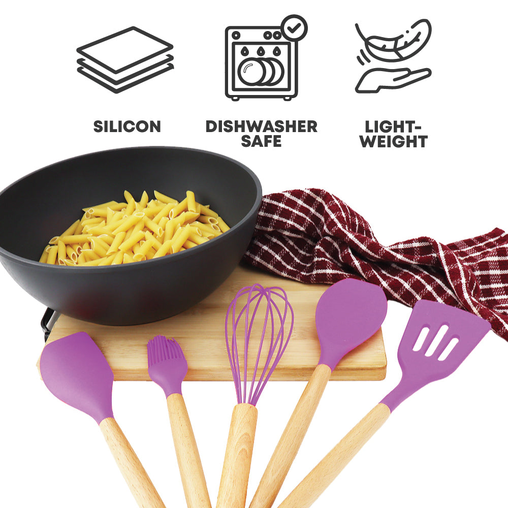 Introducing our Silicone Utensil Set in Purple, featuring five essential kitchen tools designed to make cooking a breeze. Crafted from high-quality silicone, these utensils are durable, heat-resistant, and gentle on cookware. The ergonomic handles provide a comfortable grip, while the vibrant purple colour adds a pop of style to your kitchen decor. Whether you're stirring, flipping, or serving, this versatile set has you covered.
