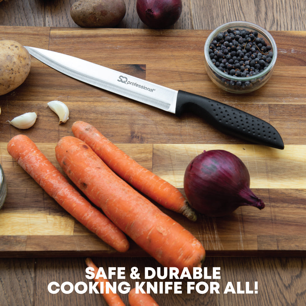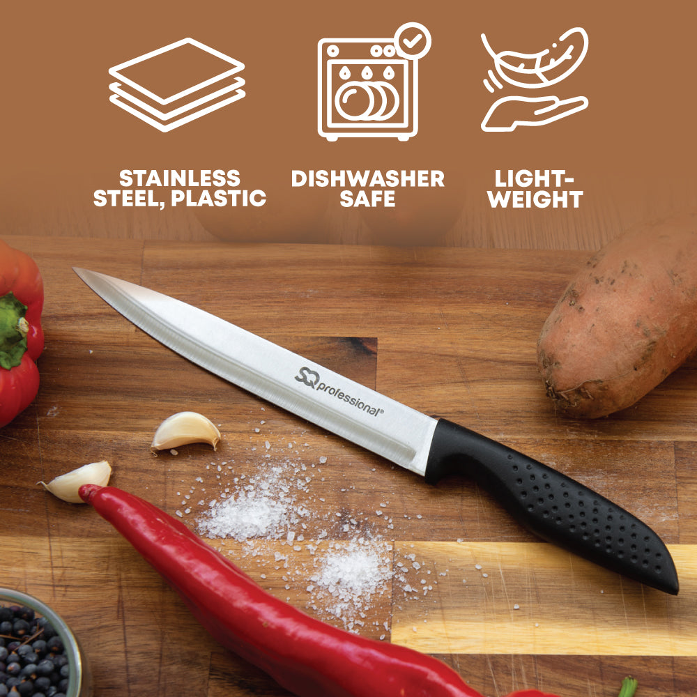 Sharpen your skills and impress your guests with Stainless Steel Knives. Perfect for everyday kitchen tasks, these knives tackle your chopping, slicing, dicing, and mincing needs with ease, whether you're working with meats, vegetables, fruits, or bread. They're practical, razor‐sharp, and precise, offering clean cuts every time. Built to last, SQ Professional knives are robust, flexible, and acid‐resistant, ensuring they become a trusty companion in your kitchen for years to come. Whether you're a seasoned chef, a culinary novice, or a passionate home cook, these knives are an unbeatable choice.