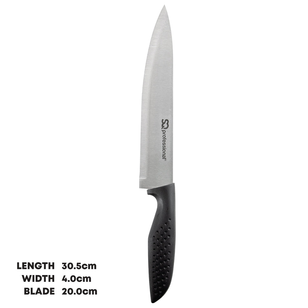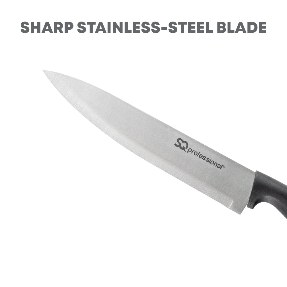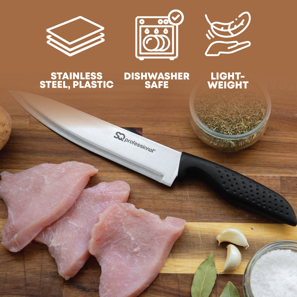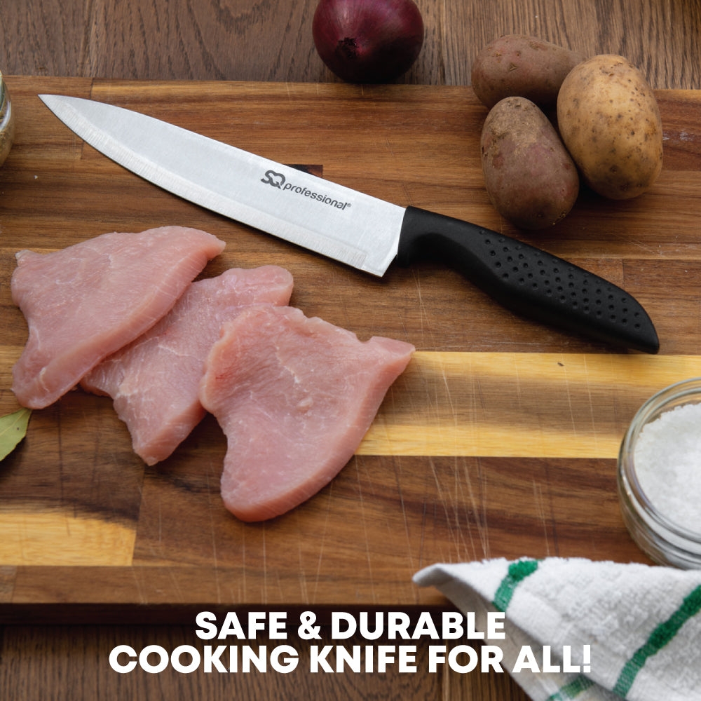 Sharpen your skills and impress your guests with SQ Professional Stainless Steel Knives. Perfect for everyday kitchen tasks, these knives tackle your chopping, slicing, dicing, and mincing needs with ease, whether you're working with meats, vegetables, fruits, or bread. They're practical, razor‐sharp, and precise, offering clean cuts every time. Built to last, SQ Professional knives are robust, flexible, and acid‐resistant, ensuring they become a trusty companion in your kitchen for years to come. Whether you're a seasoned chef, a culinary novice, or a passionate home cook, these knives are an unbeatable choice.
