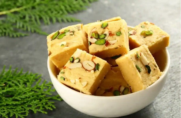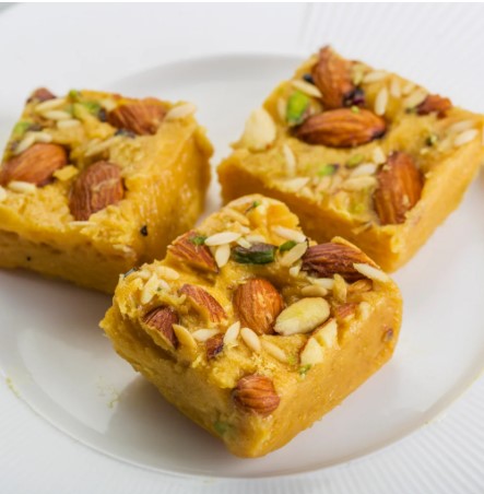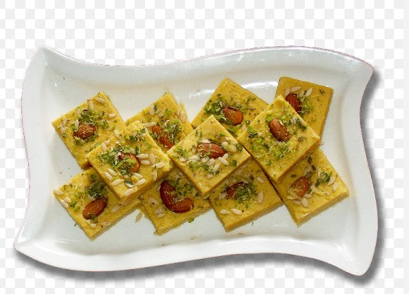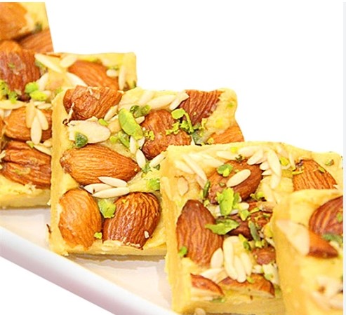 - The slight crisp nature enhances the way it melts right into your mouth flooding it with the sweetness and goodness of besan, ghee, and flour, garnished with pistachio and cashews on the top to take better care of your guests and families.