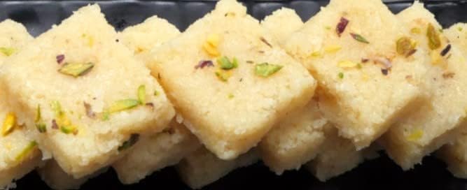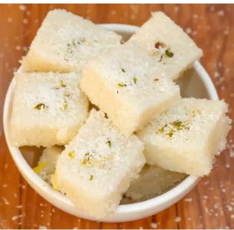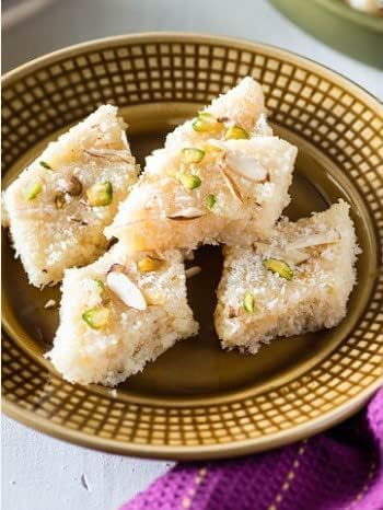 - A traditional Indian sweet made from desiccated coconut, flavored with cardamom and sugar.