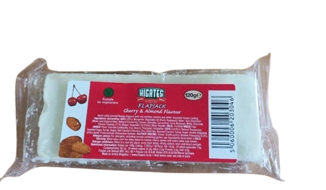- Cherry and Almond flavour flapjack. Hand rolled almond flavour flapjack with red candied cherries and white chocolate flavour coating.