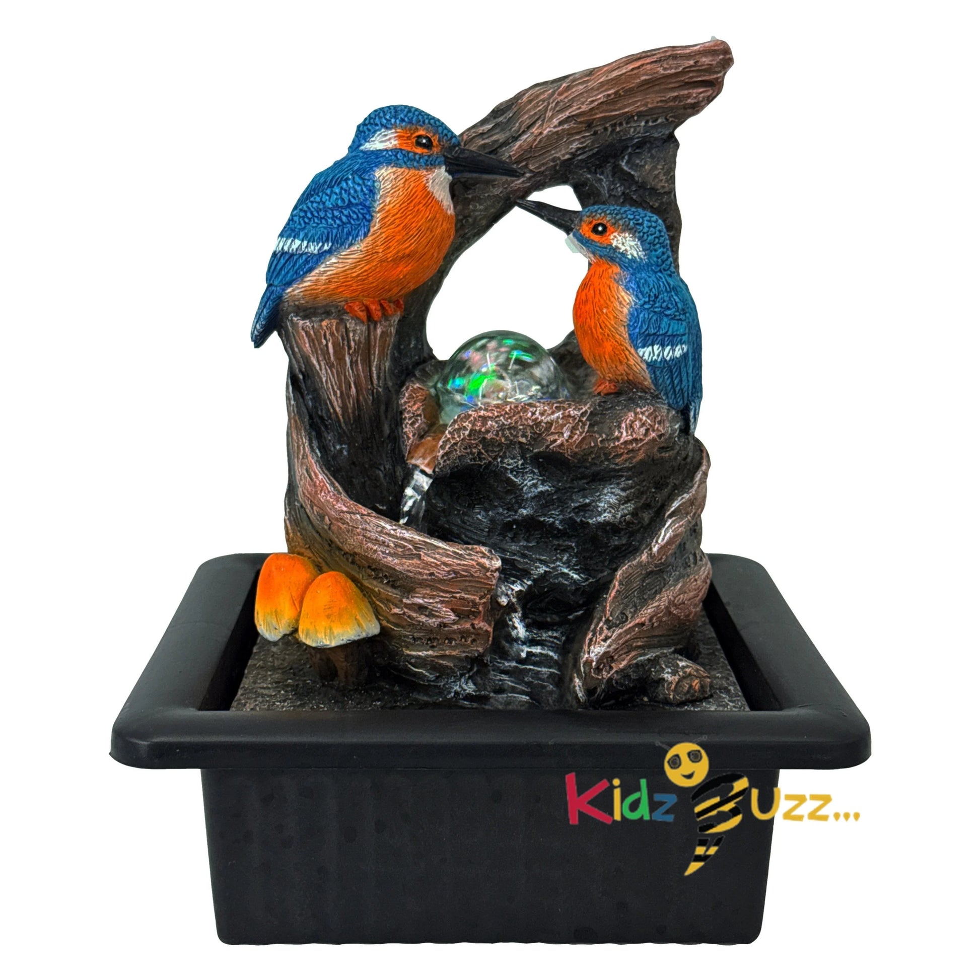 At its heart are two graceful kingfisher birds, perched serenely on branches, their vibrant plumage comes to life in the light. Between them lies a mesmerising glass spinning ball that spins with the power of the flowing water, a symbol of harmony and balance.