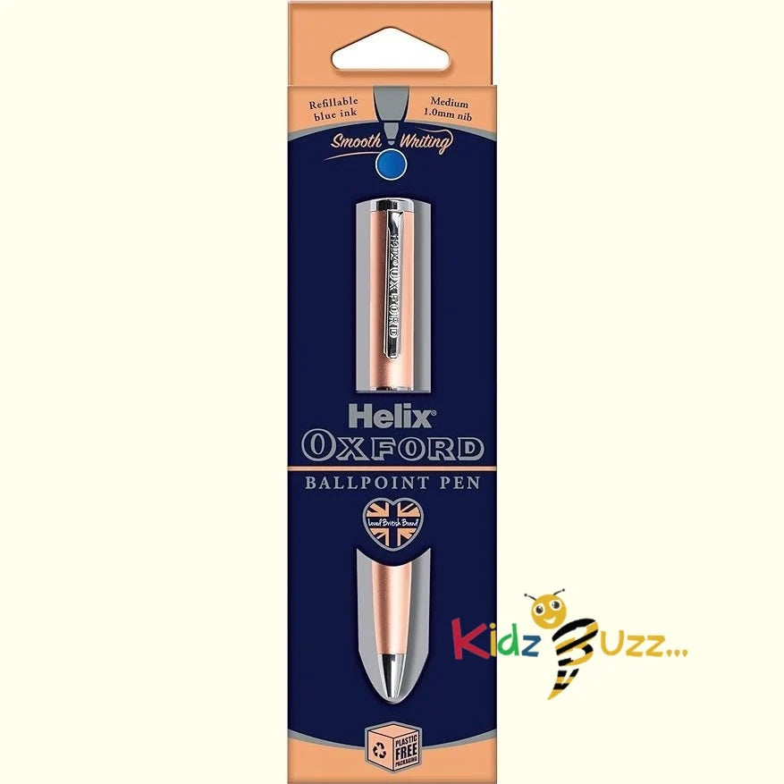 Balanced metal barrel that is rounded and comfortable to hold Consistent ink flow for smooth writing Embossed Helix Oxford lid clip Plastic free cardboard packaging